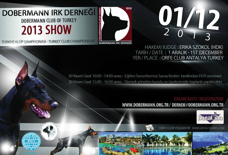 Bu yıl üçüncüsü gerçekleşecek Türkiye Kulüp Şampiyonasının yine ülkemizin güzide şehri Antalya’da düzenlemekteyiz. Bu seneki şampiyonamıza geçen yıl olduğu gibi Orfe Club ev sahipliği yapacaktır. Ülkemizden ve yurtdışından birçok Dobermann ın katılacağı bu yarışmanın geçen yıllarda olduğu gibi büyük bir heyecana sahne olmasını bekliyoruz. 2013 Türkiye Kulüp Şampiyonası’nın hakemliğini Macaristan Dobermann Kulubünden Erika Szokol yapacaktır. Tüm Dobermann sevenleri Antalya Orfe Club te düzenlenecek olan Türkiye Kulüp Şampiyonamızda misafir etmekten mutluluk duyarız..